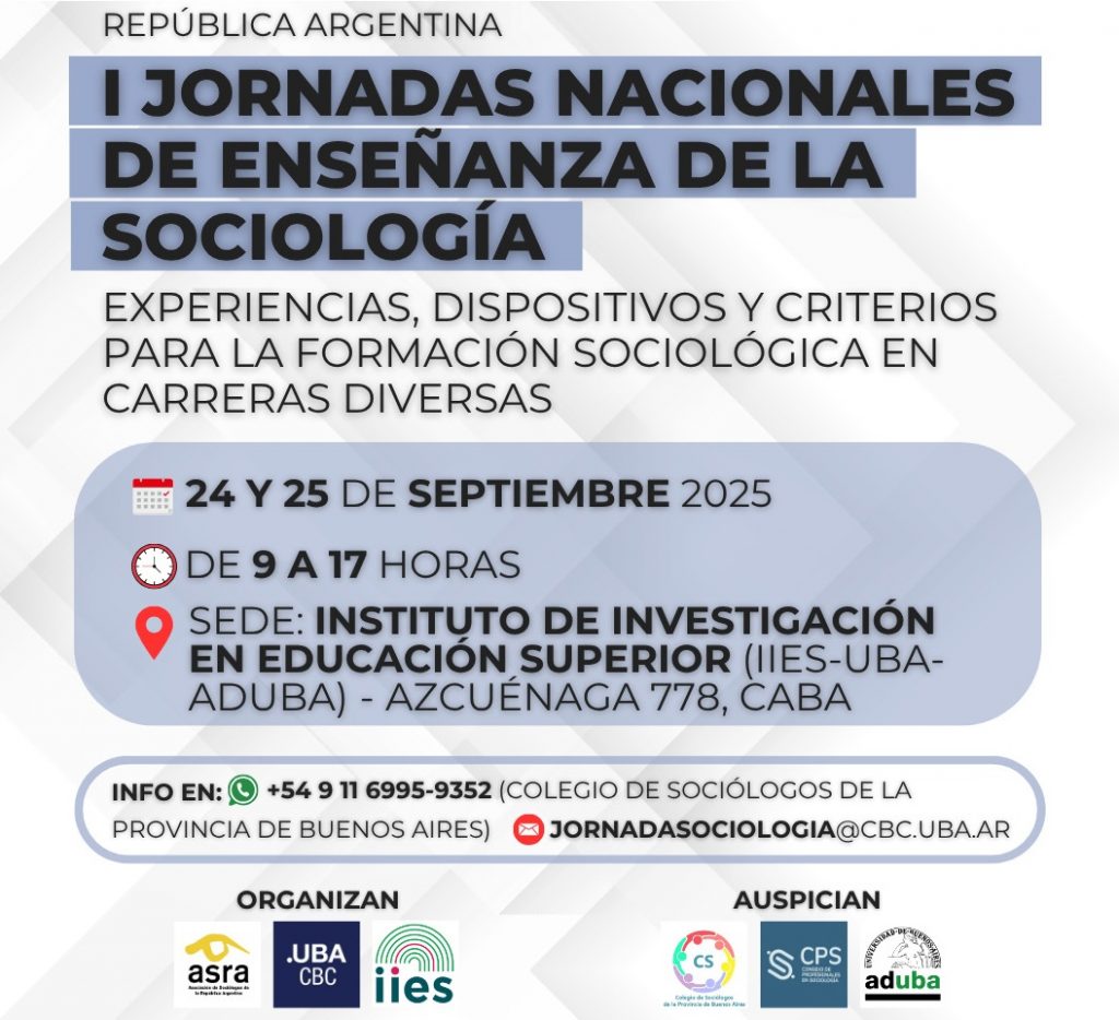 Los días 24 y 25 de septiembre de 9 a 18hs se estará realizando en la sede del IIES ADUBA-UBA, ubicada en Azcuénaga 778 (CABA) esta primera jornada organizada en conjunto entre la Asociación de Sociólogos de la República Argentina (ASRA), el Ciclo Básico Común de la UBA y el IIES ADUBA-UBA, junto con el auspicio del Colegio de Sociólogos de la Provincia de Buenos Aires, el Consejo de Profesionales de Sociología y la Asociación de Docentes de la Universidad de Buenos Aires.